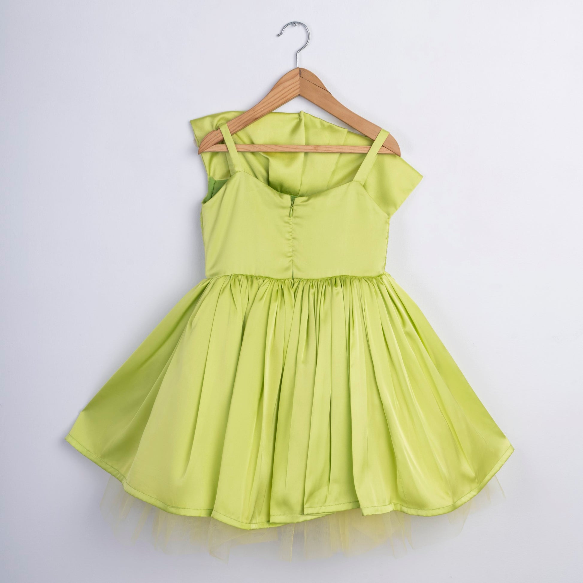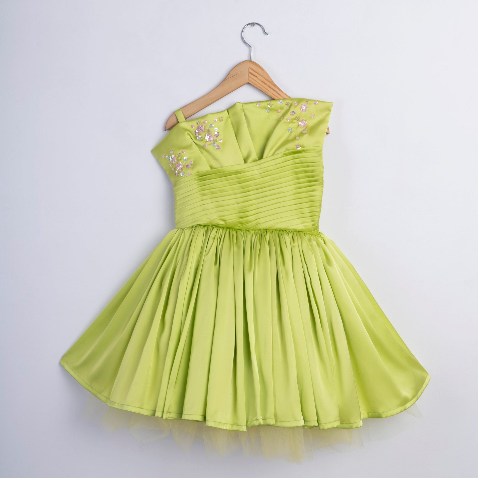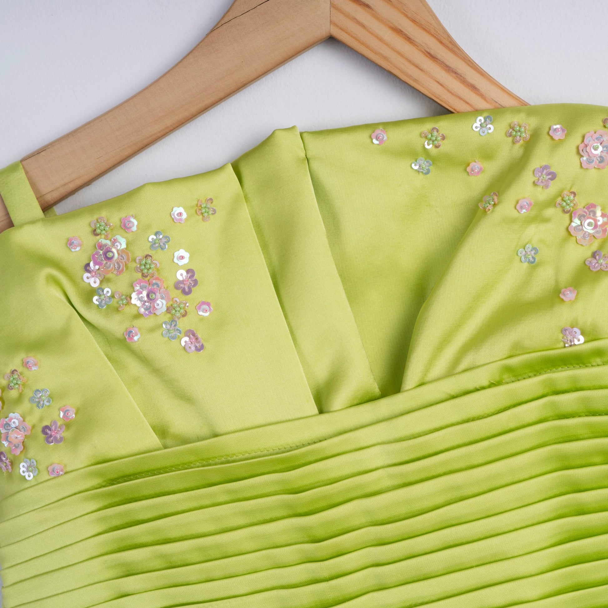 Green satin partywear frock with unique neck pattern. Embroidered detailing on the neckline. Pleated body for a structured look. Gathered flare for added volume. Extended net for a graceful silhouette. Back zip closure for a seamless fit.