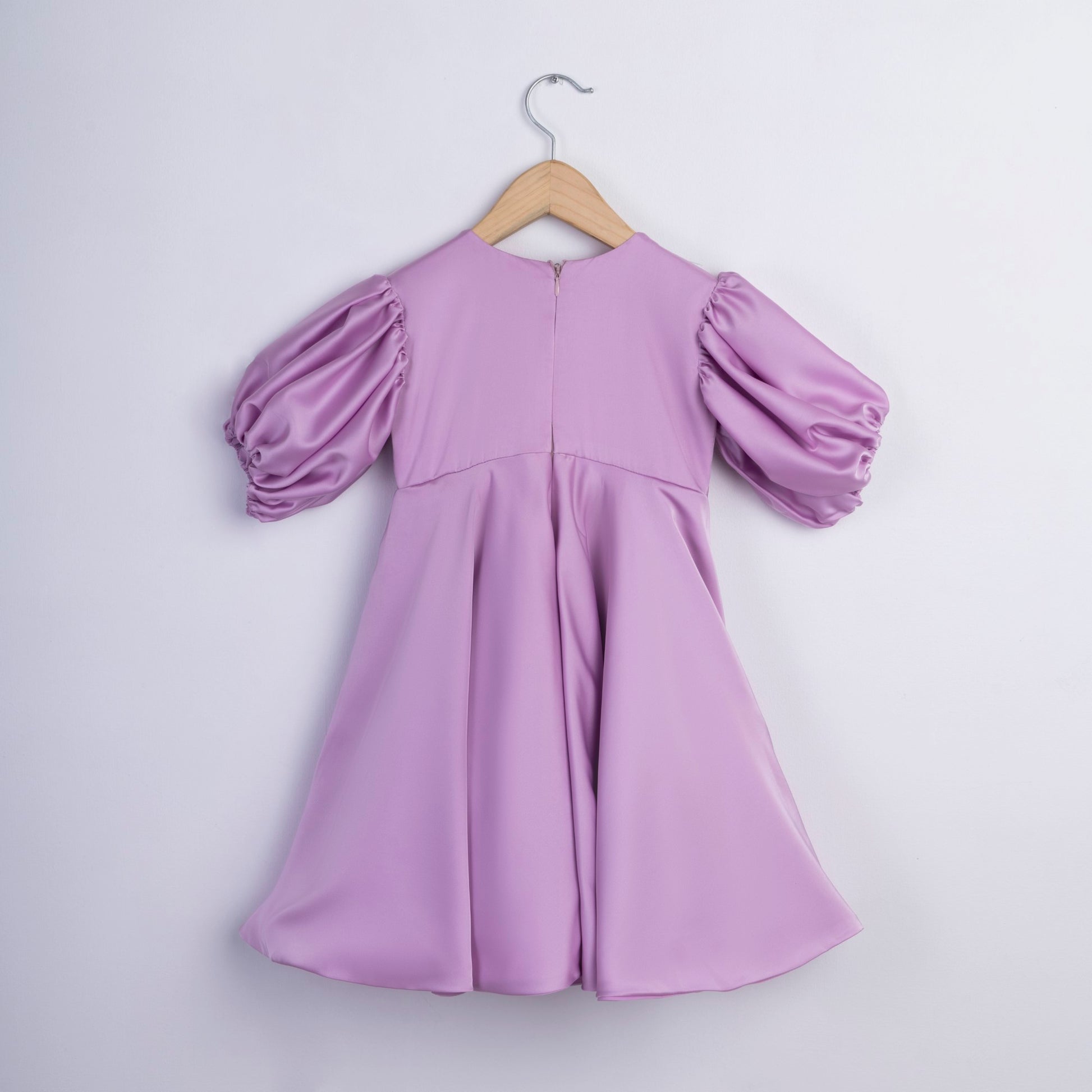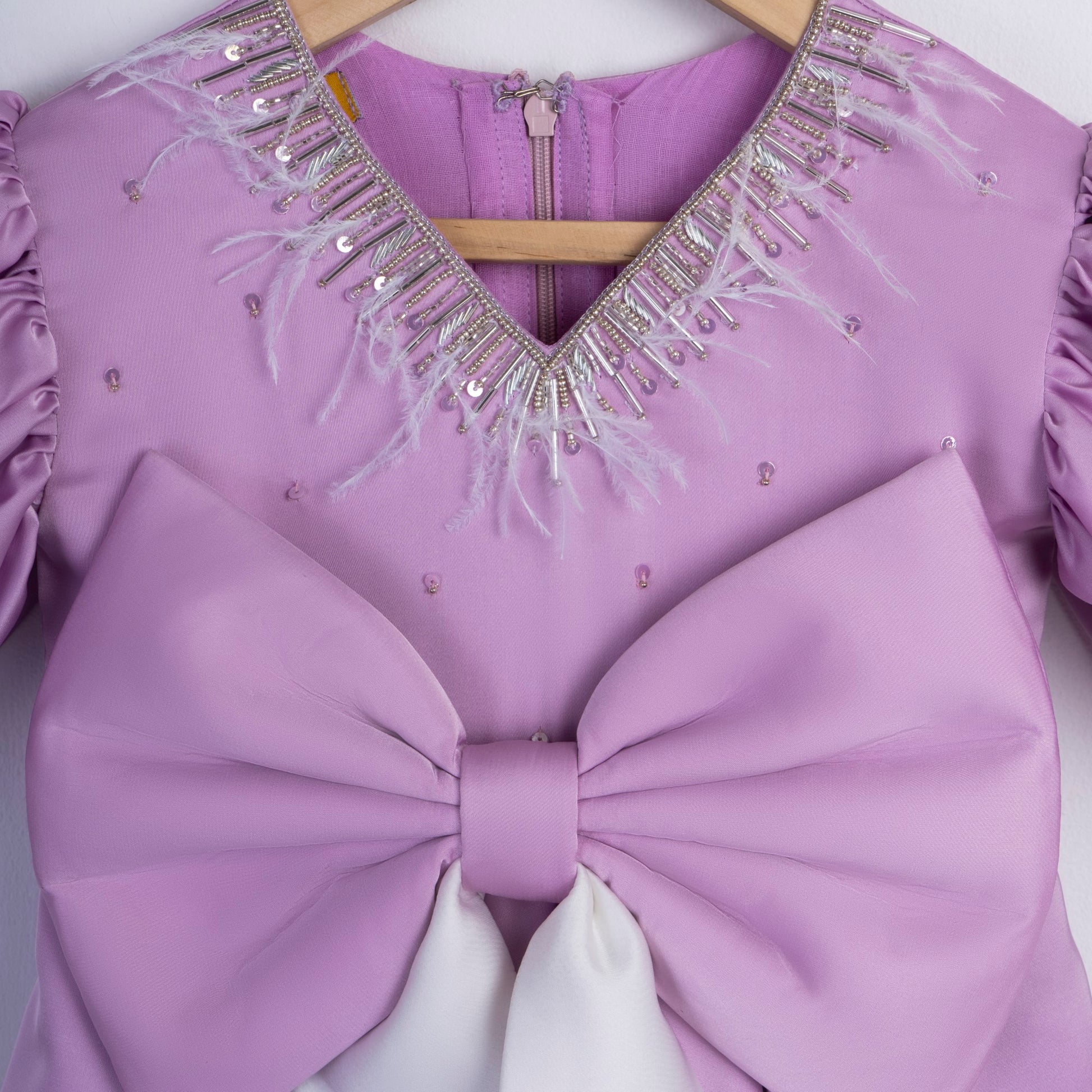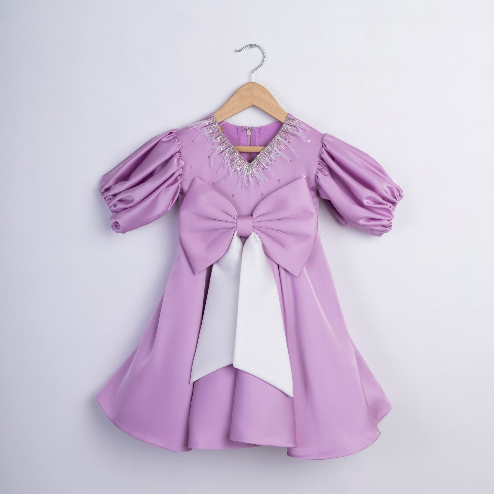 Lilac satin fabric with a V-neck design. Silver embellishments with white fur on the neckline. Puff sleeves for a charming look. Front bow detailing adds elegance. Back zip closure for easy wear.