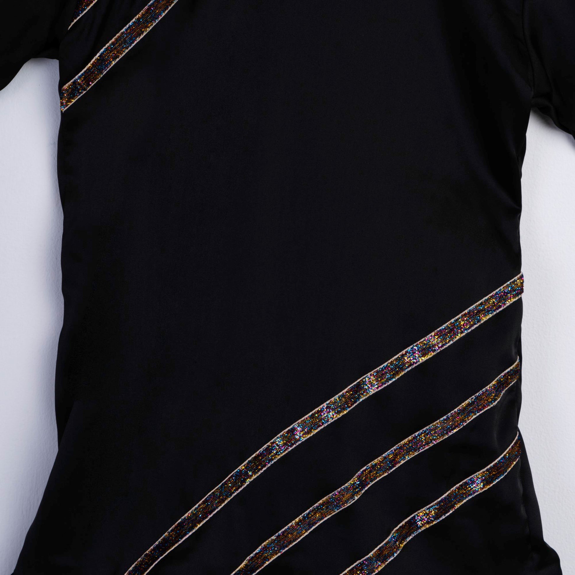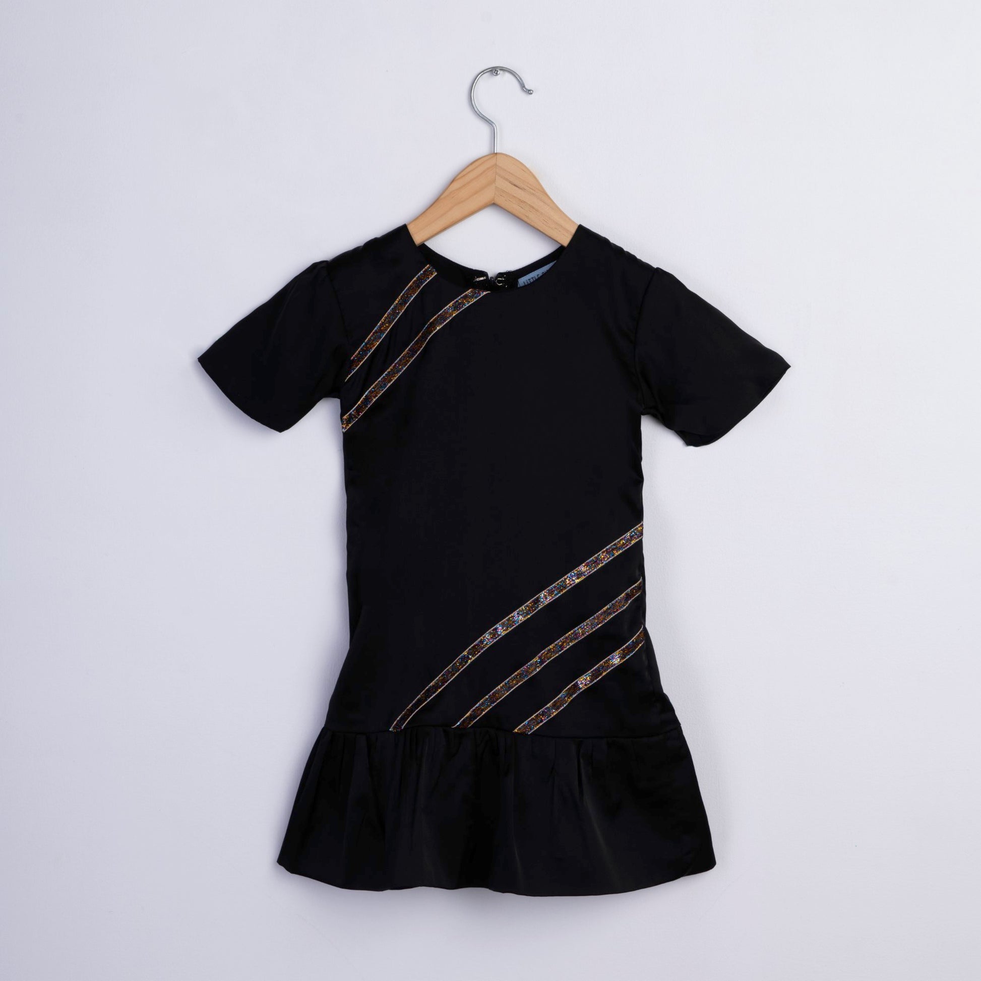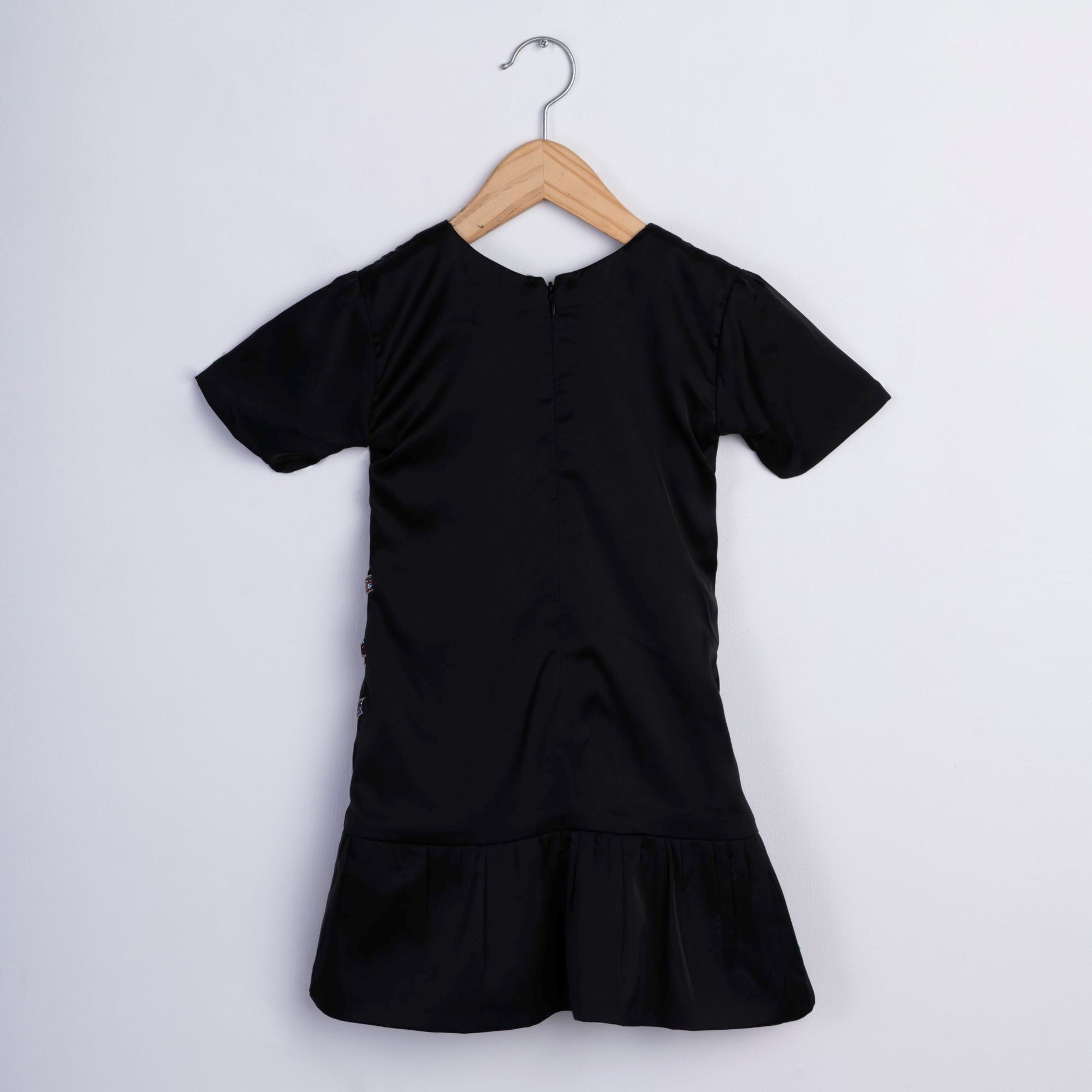 Black satin dress. Multicolored shimmer lace. Half sleeves. Gathered hem layer. Round neck. Back zip closure.