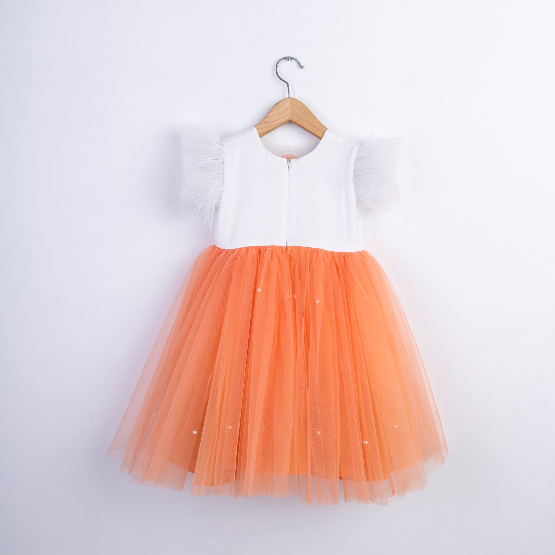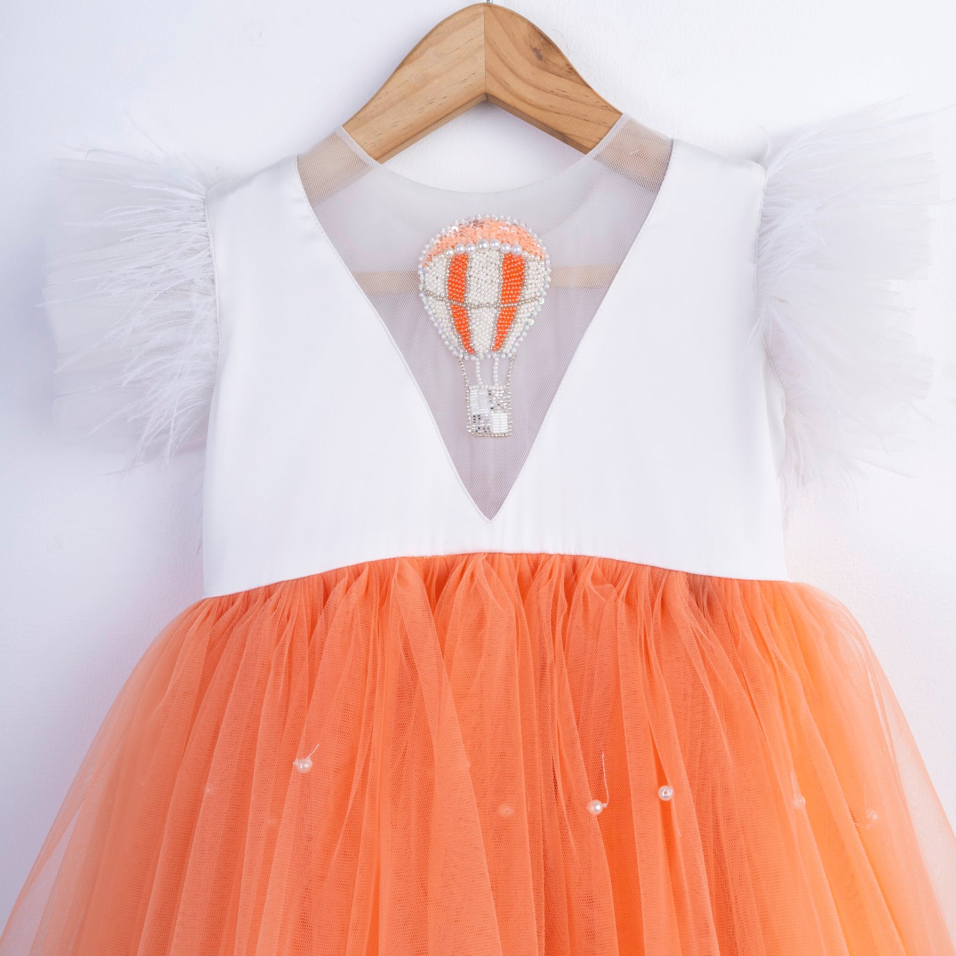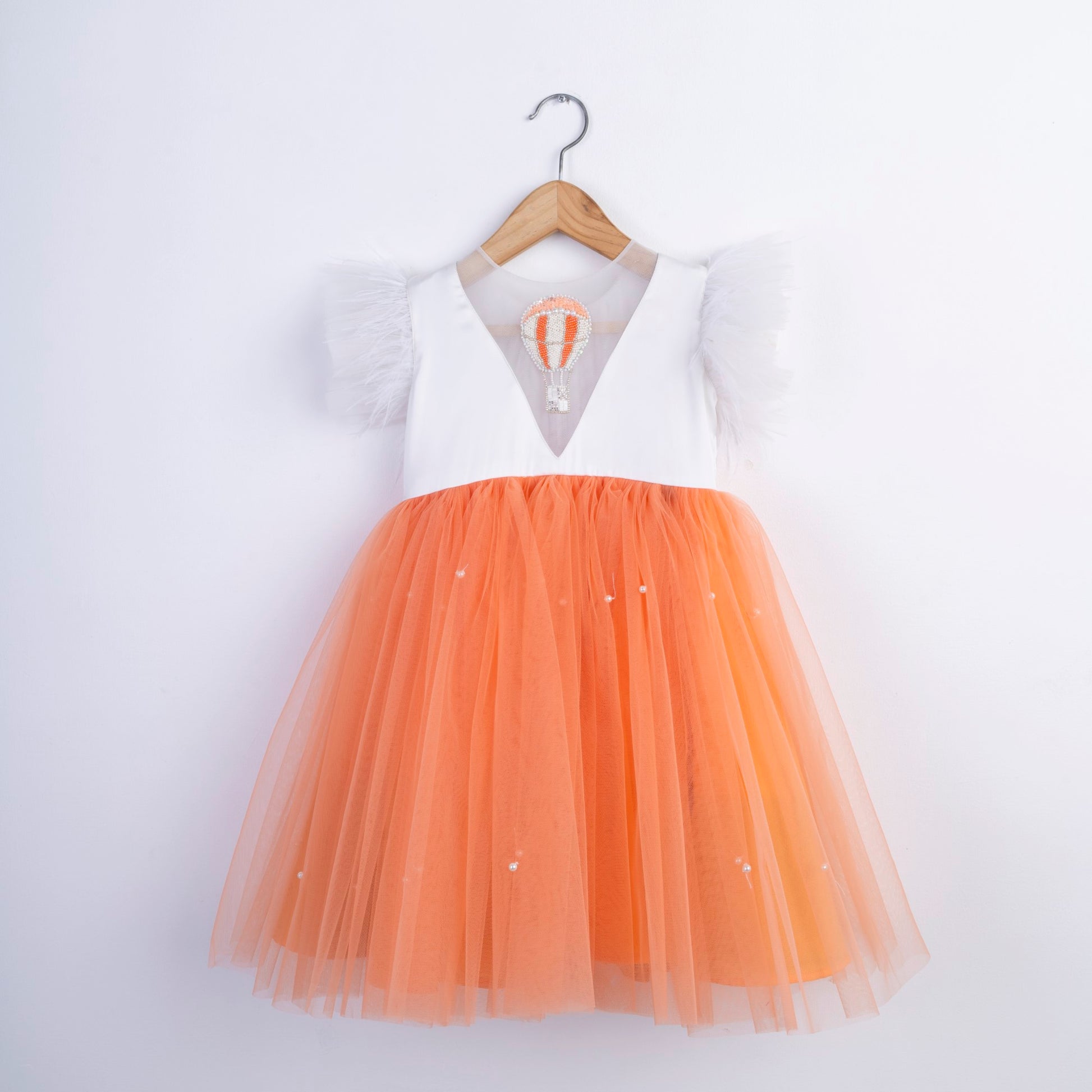 White satin yoke with a V-neck made of net. Hot air balloon embroidery on the net neck. Armholes adorned with net frill and fur. Gathered orange net flare with pearl drops. Back zip opening for easy wear.