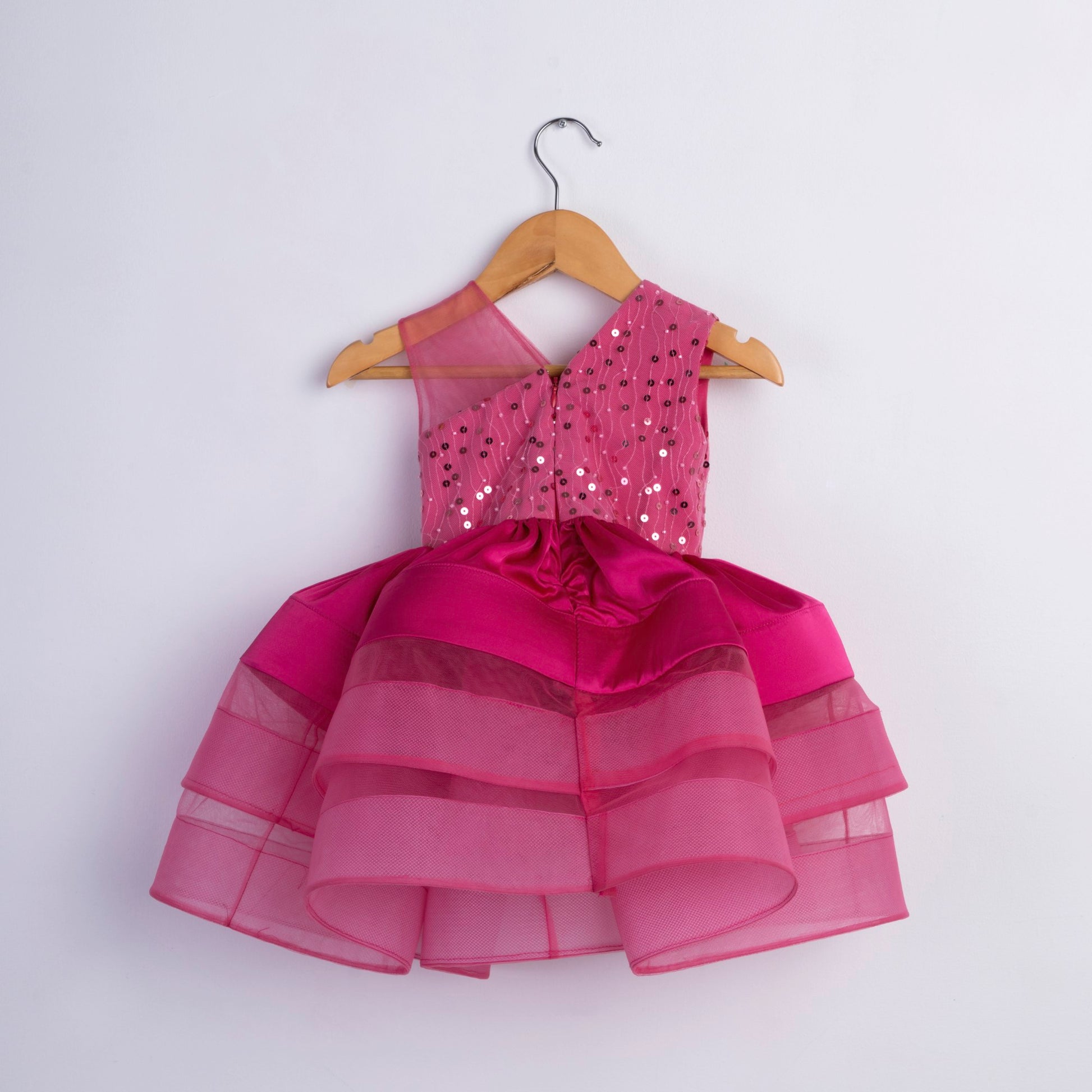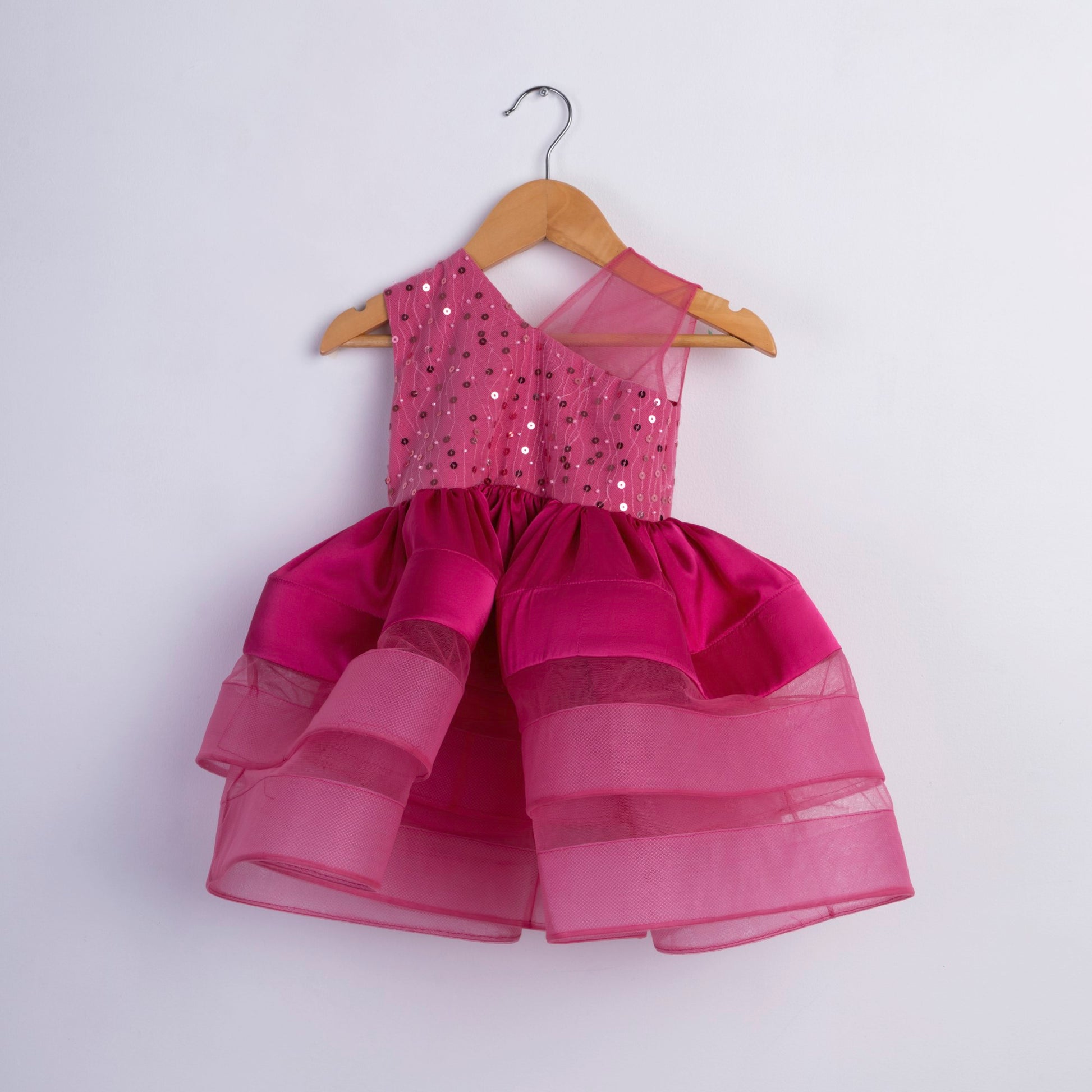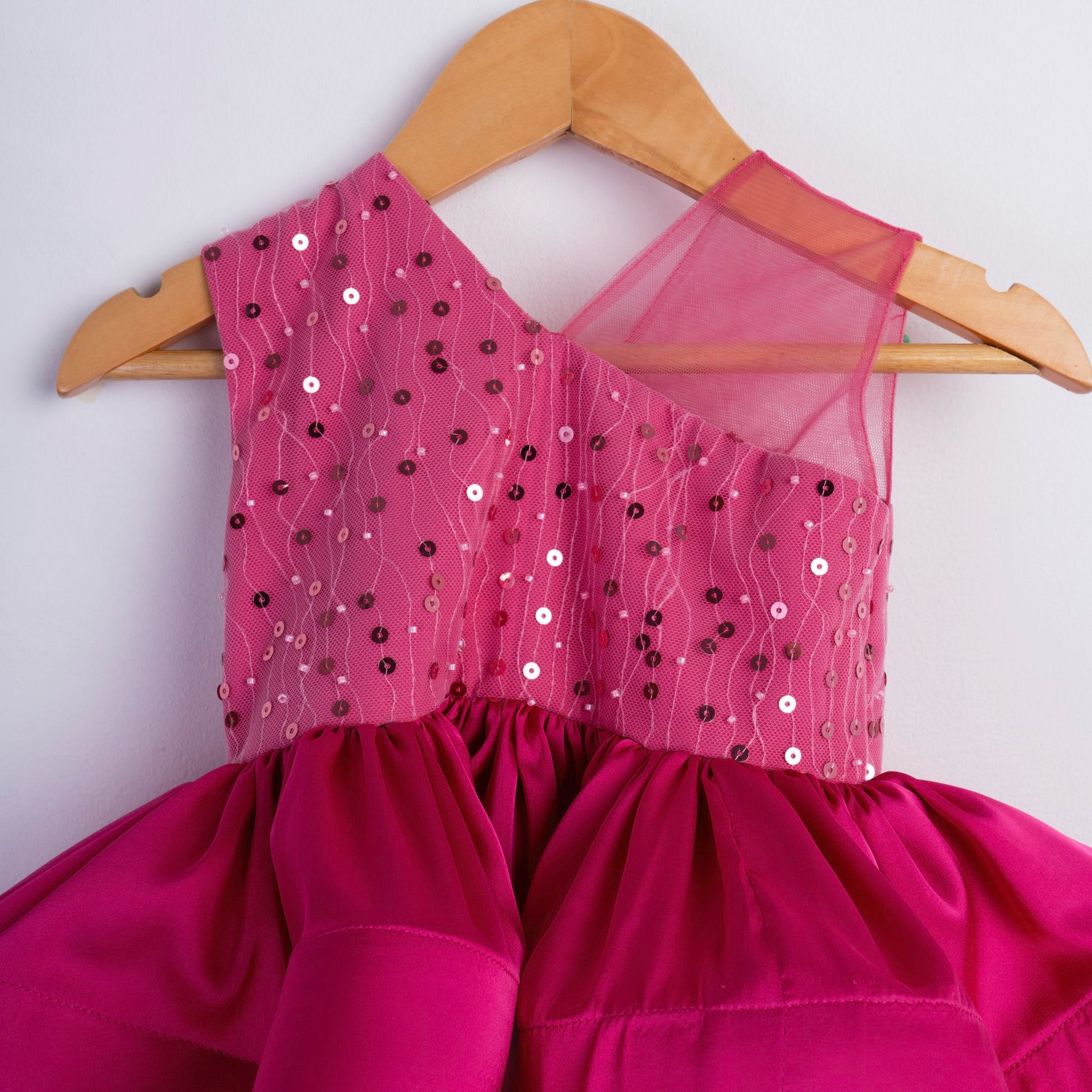Pink partywear frock with one-shoulder design. Pink sequin bodice for added sparkle. Satin and net layered flare for a voluminous look. Back zip closure for a smooth fit. Elegant and glamorous style.
