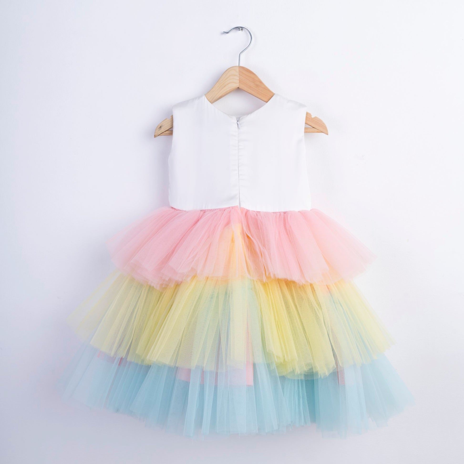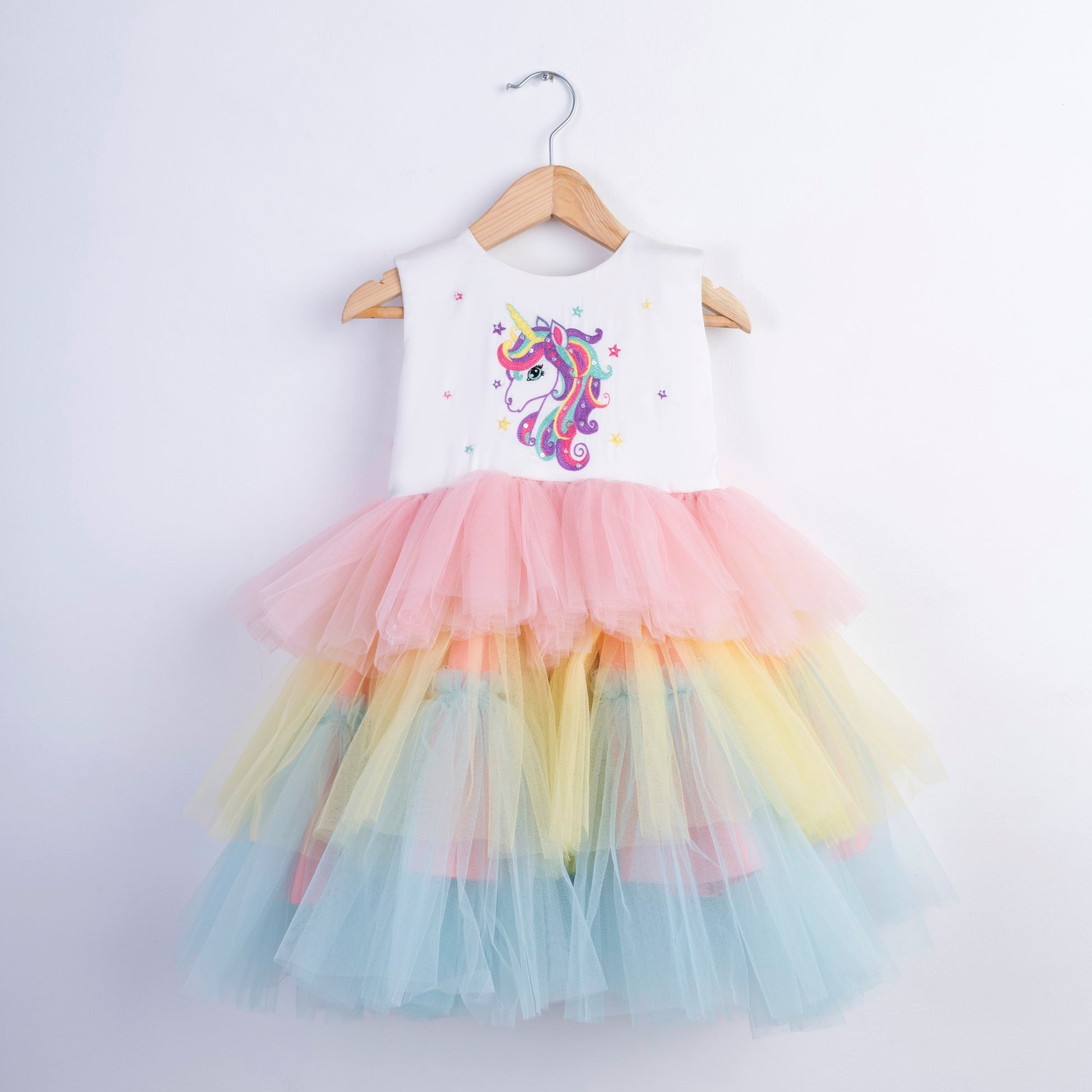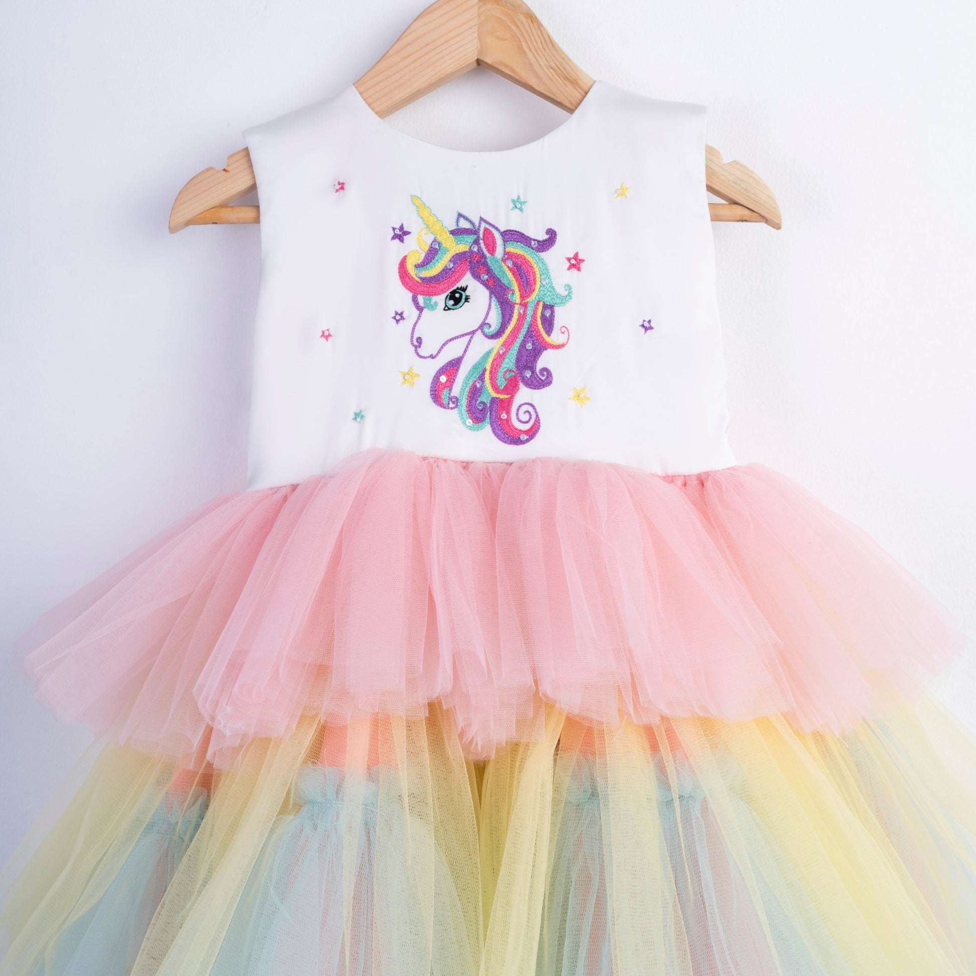 Three pastel-colored layered flare. White satin yoke with unicorn embroidery. Comfortable and stylish fit. Perfect for parties and special occasions.