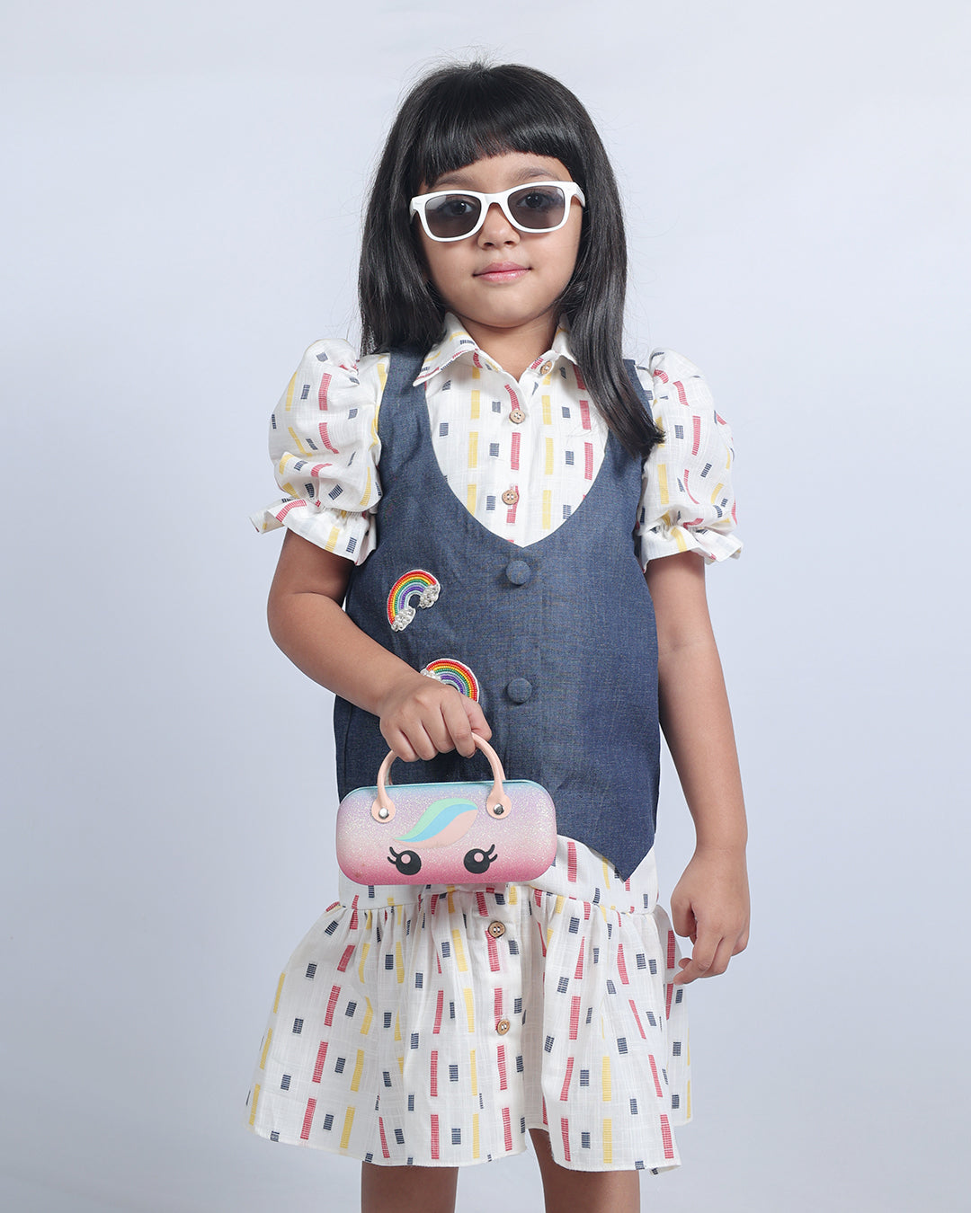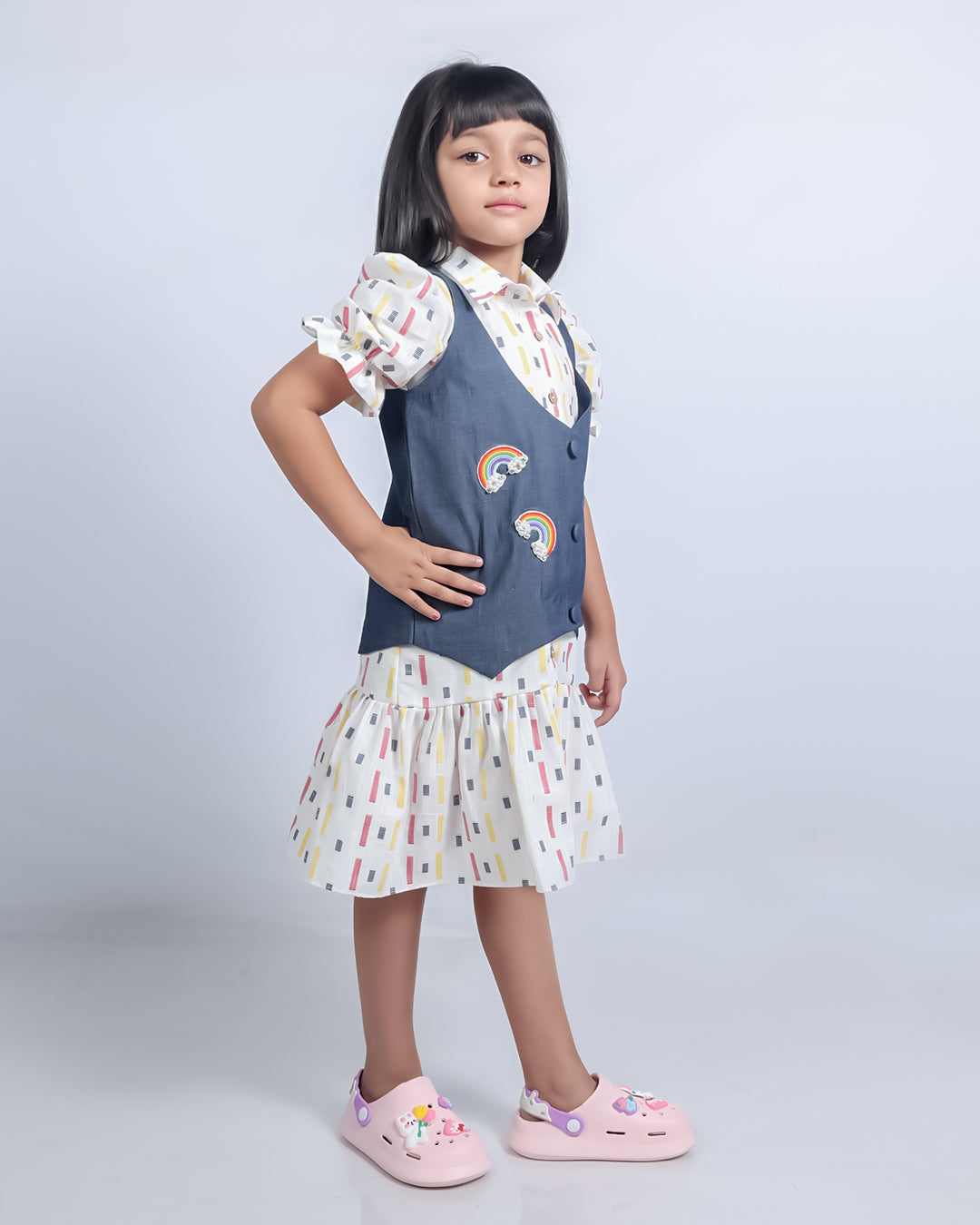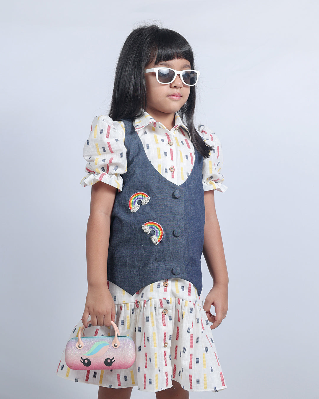 WHITE SHIRT DRESS WITH RAINBOW DENIM JACKET