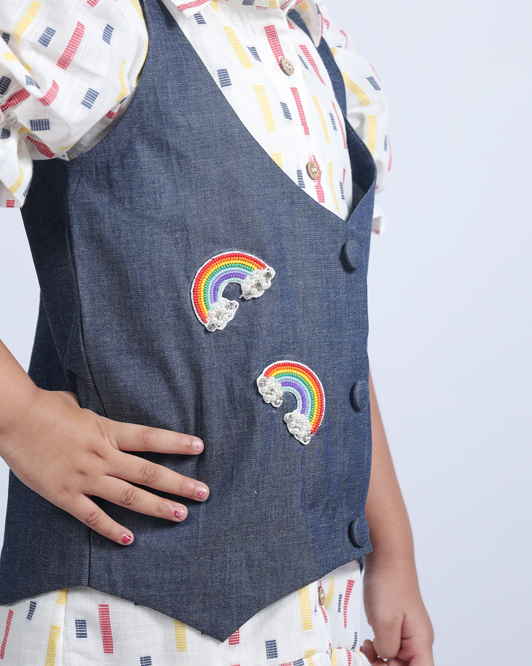 -Vest coat adds a trendy layer with a hand-embroidered rainbow patch