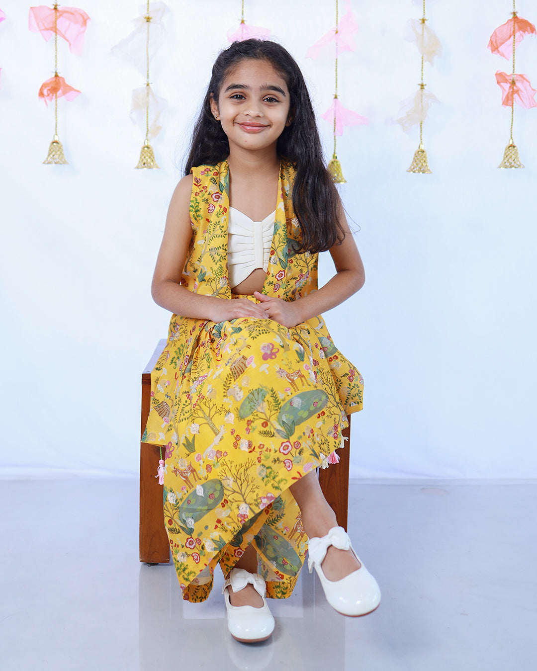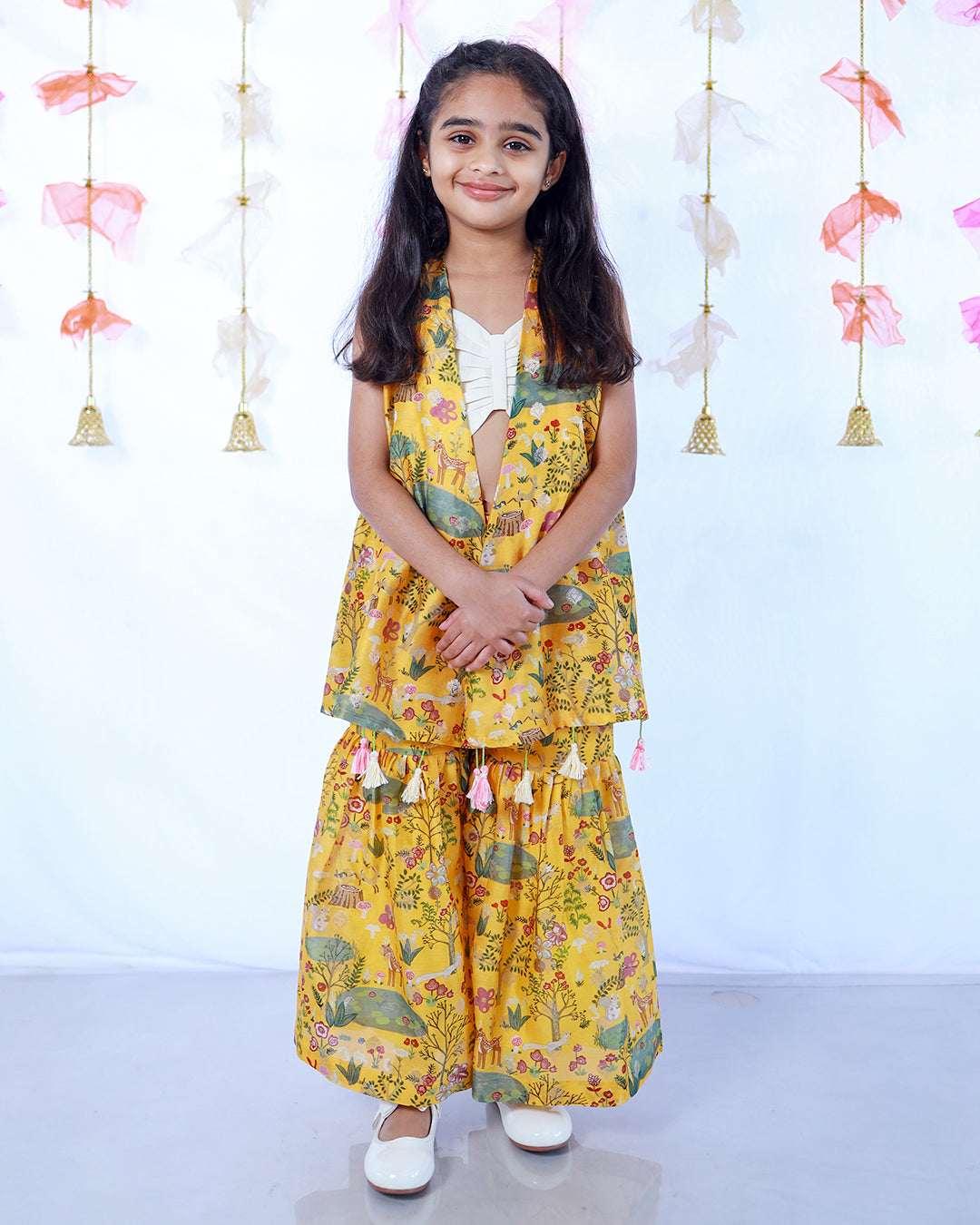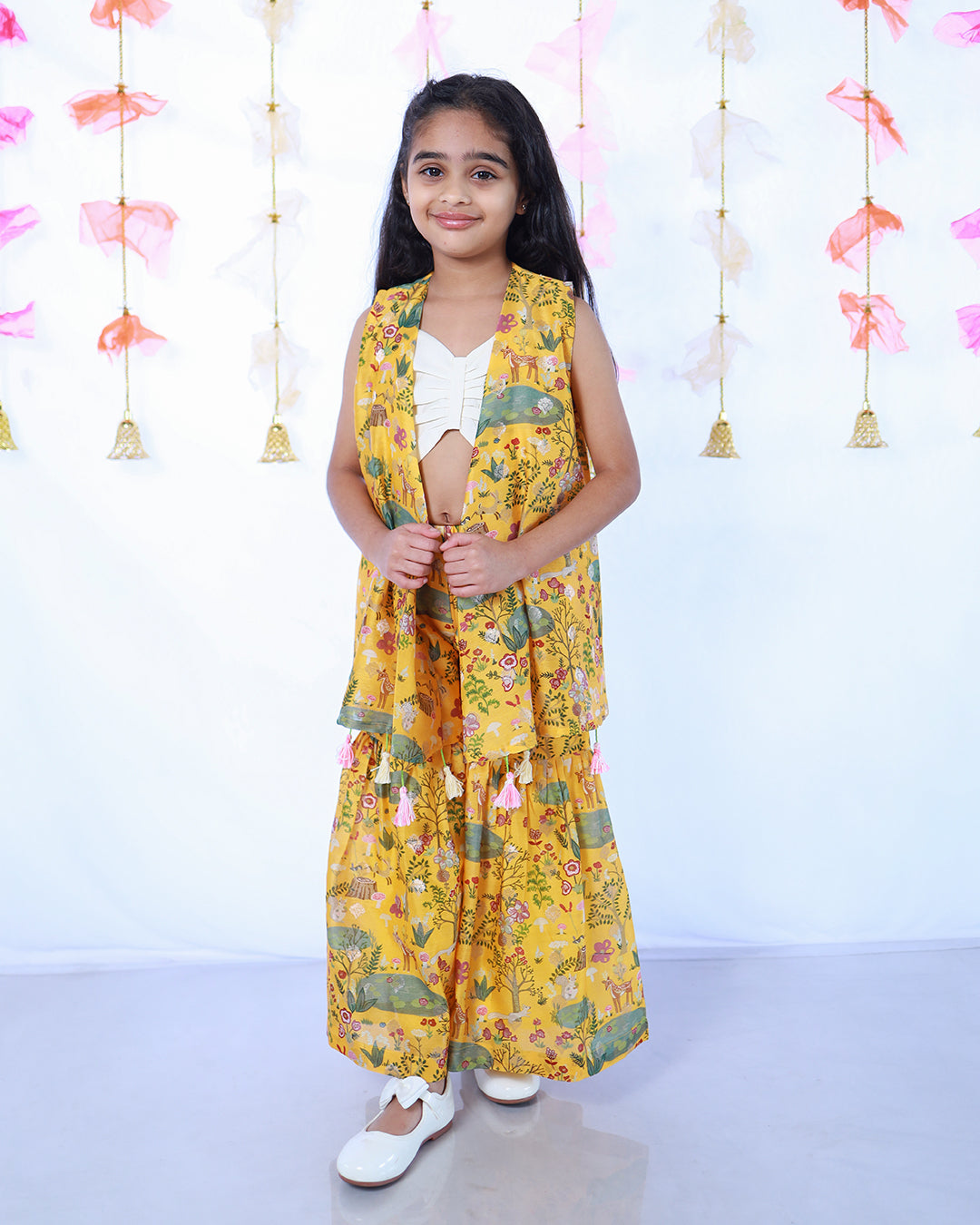YELLO ANIMAL PRINT JACKET AND SHARARA WITH OFFWHITE CROPTOP