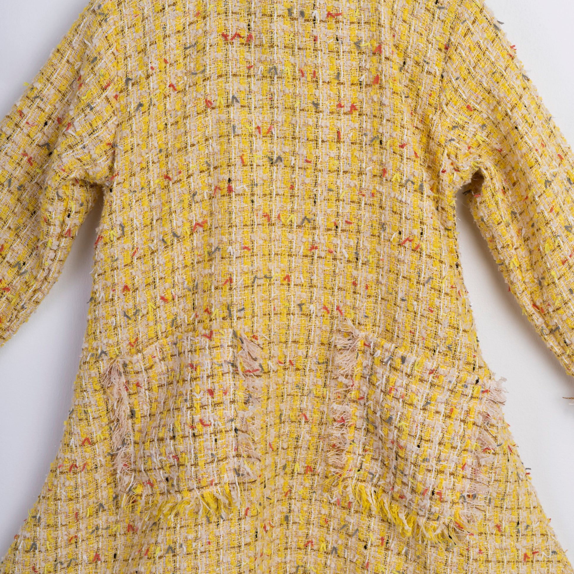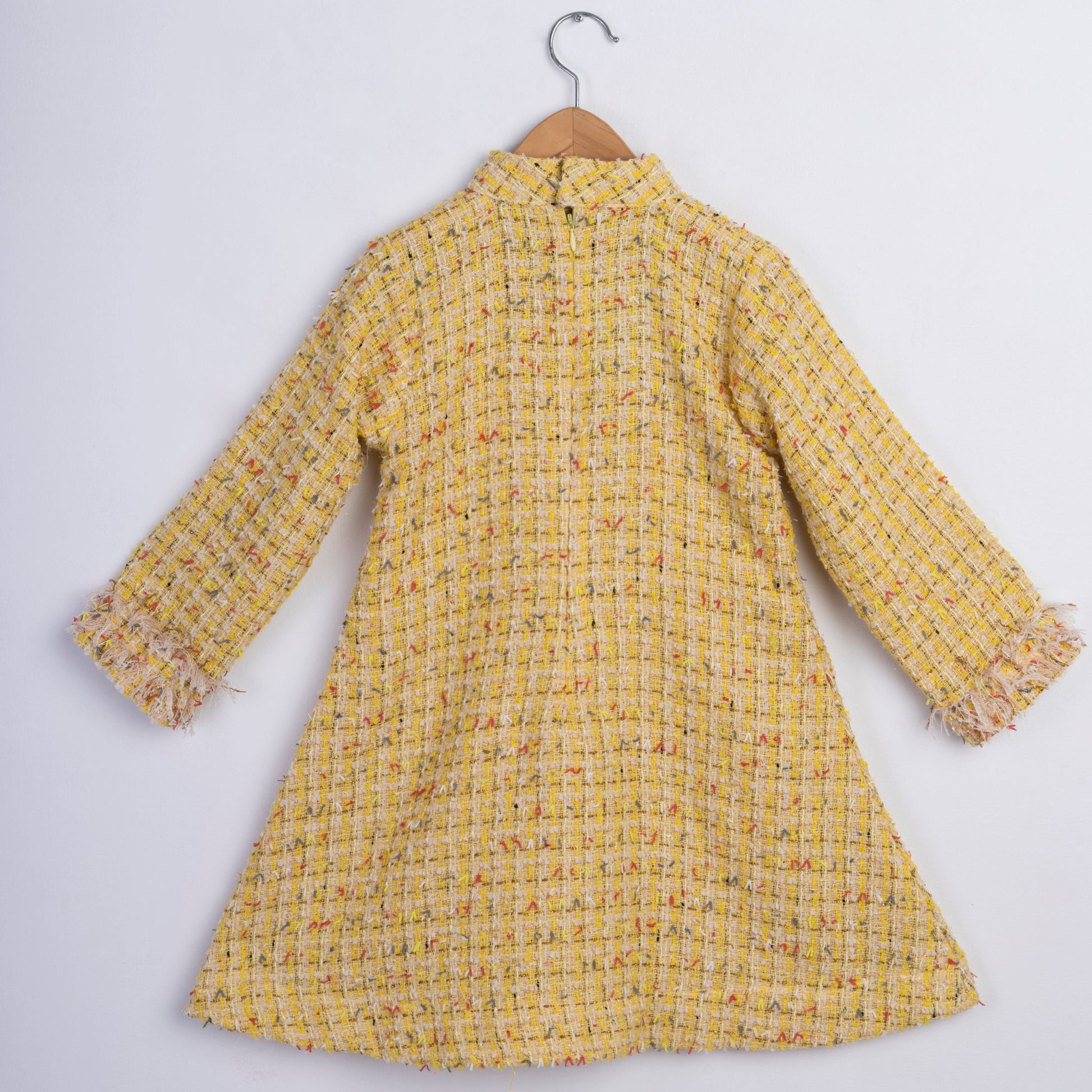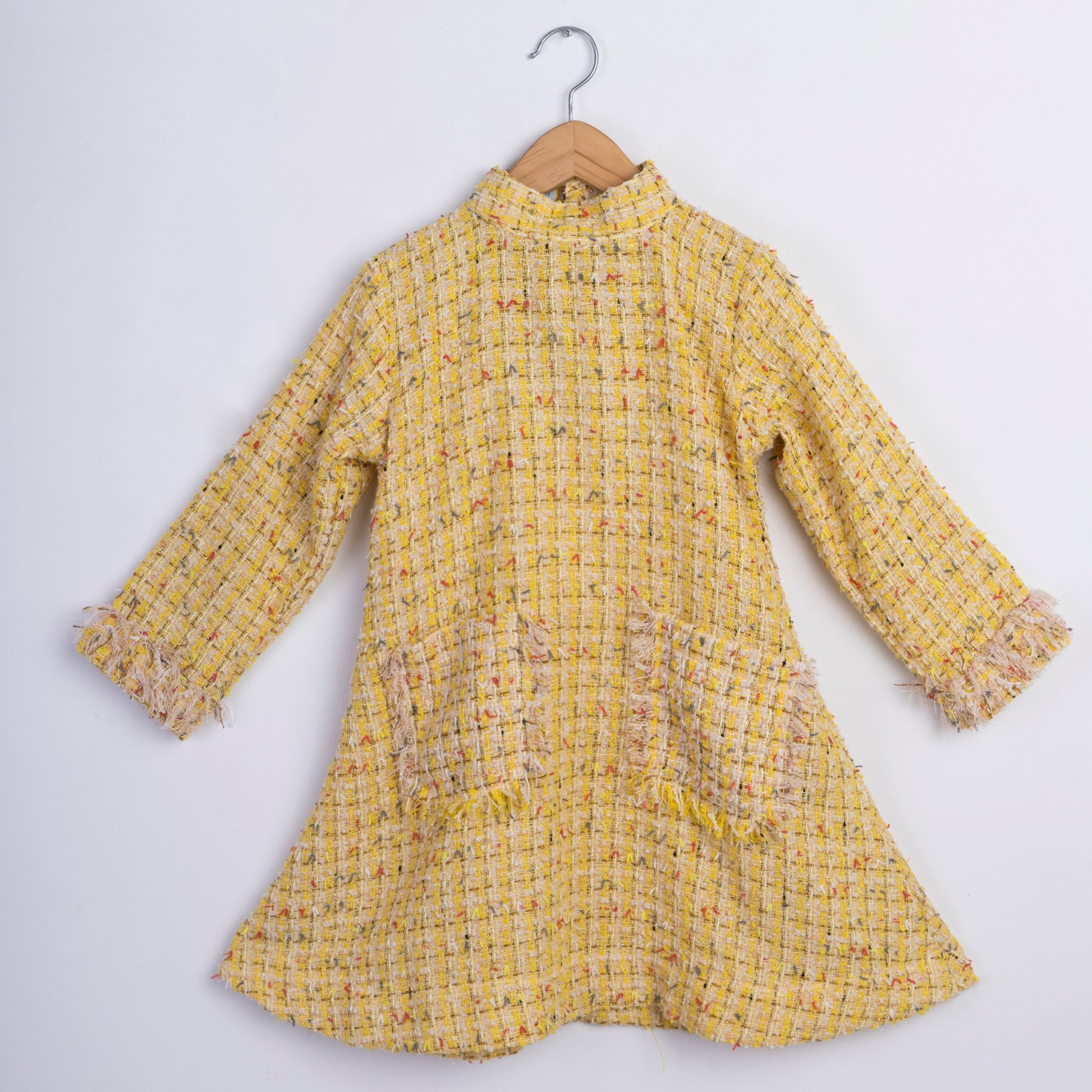Yellow tweed fabric frock. Stand collar for a polished look. Full sleeves for added elegance. Two functional patch pockets. Back zip closure for convenience.